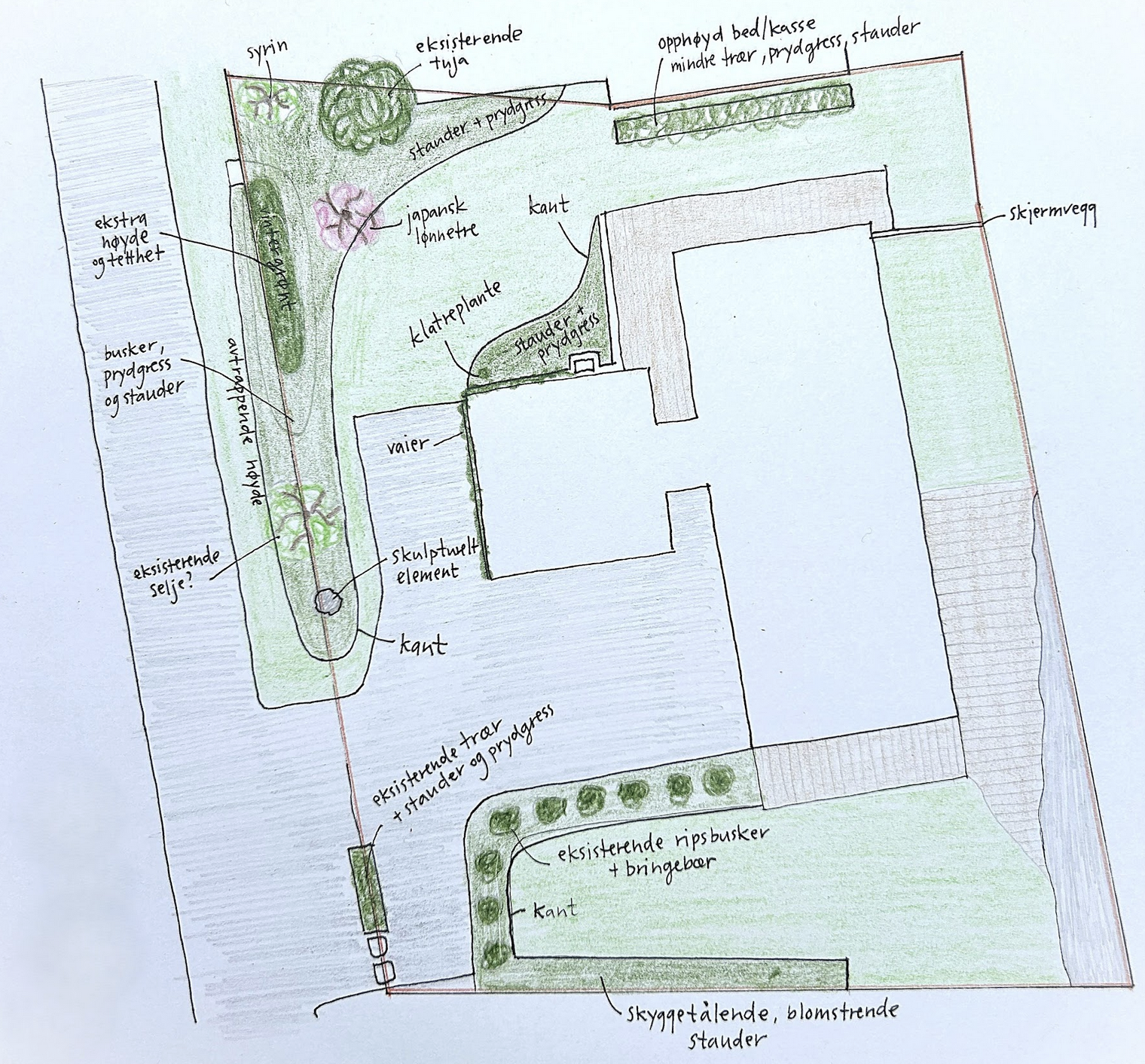 En inspirerende og oversiktlig skisse som gir deg retning og nye muligheter for hagen. Her får du forslag til soner, uttrykk, flyt i hagen og generelle planteforslag – perfekt dersom du ønsker et kreativt utgangspunkt du kan jobbe videre med i eget tempo.